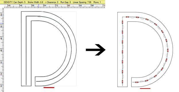 In questo esempio, abbiamo la lettera D con una singola corsa suggerita dalle linee guida sulla densità. Possiamo vedere dalle informazioni nella ricerca della densità che la profondità della lattina è 5″, la larghezza del tratto è 6,6″, la distanza e la distanza tra le vie sono entrambe 0, la spaziatura lineare è 7,06″ e il numero di righe è 1. La popolazione risultante si trova sulla destra.